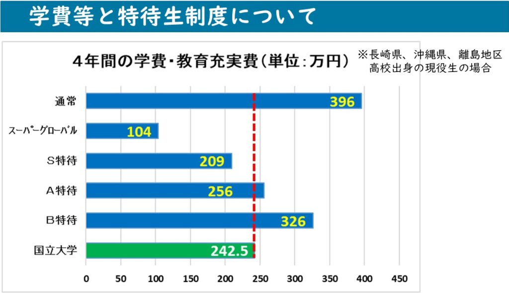 ・A特待は、1~4年次の授業料が50%減免、4年間の学費は国立大学とほぼ同額になります。