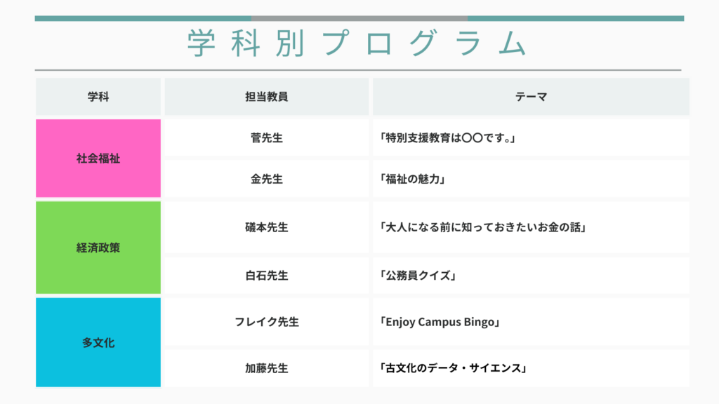 学生による学科紹介、入試制度・特待生制度説明、学科別プログラム(模擬講義等)、学生企画イベント、キャンパスツアー、個別相談会などを予定しています。お友達やご家族とご一緒にお越しください。