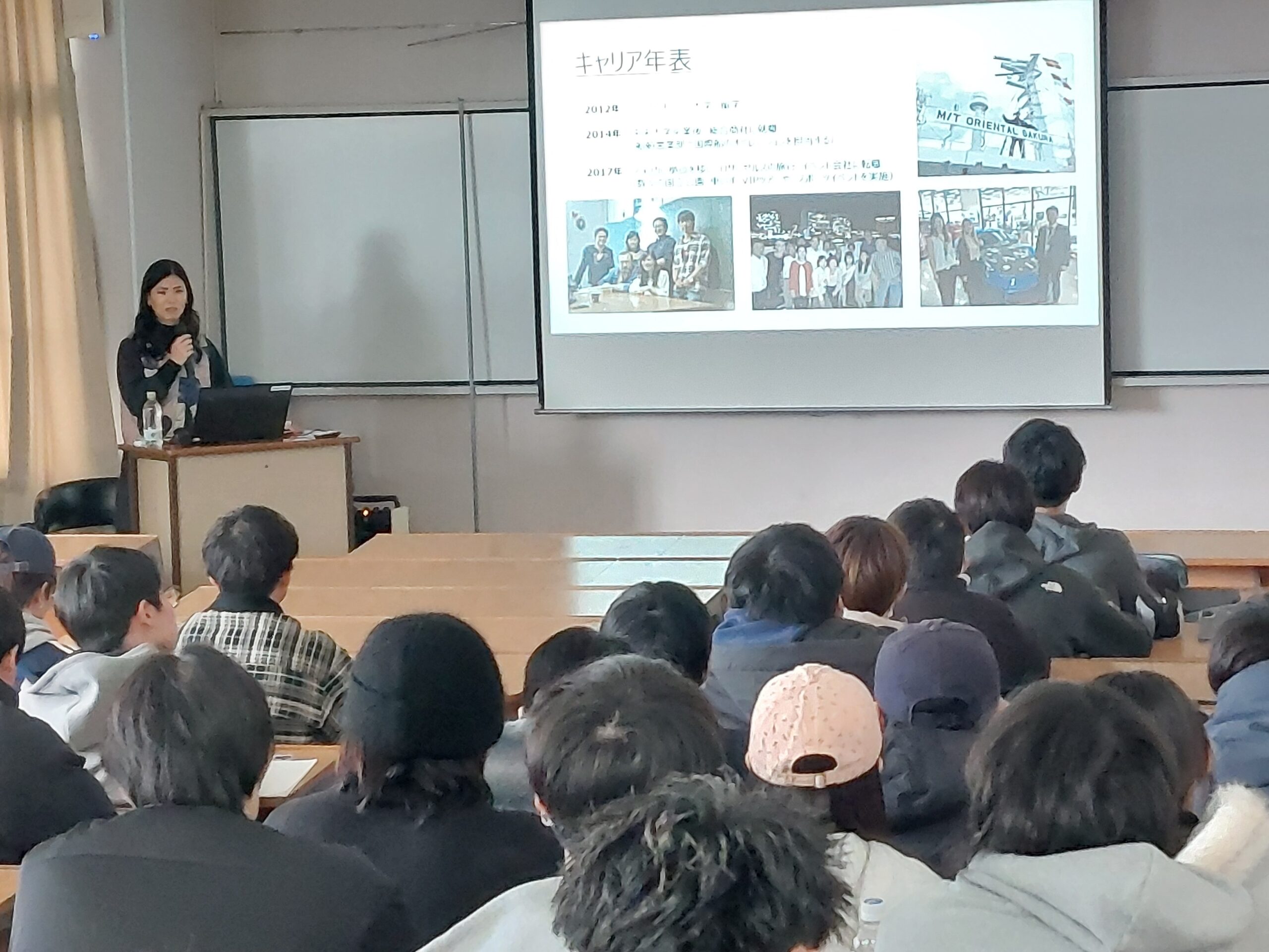 まず、笠井先生ご自身のこれまでのキャリアが紹介されました。海外留学や国内外の企業での勤務を経た後、コロナ禍という外的な環境変化を契機に長崎へ戻り、家業である不動産・建設業を継ぐ選択をされたことが語られました。帰郷は当初から予定されていたものではなく、状況に直面しながらも最終的には「自分自身で選び取った決断」であった点が強調されました。あわせて、日本企業と海外企業、さらには地方における働き方や価値観の違いについて、実体験に基づく具体的な比較が示され、正確さや調和を重んじる日本企業、スピードと判断力が求められる海外企業、そして人間関係や信頼を基盤とする地方の特徴が紹介されました。こうした話題を通じて、学生は「どこで、どのように働くのか」という問いを自身の将来と重ねながら考える機会を得ることとなりました。