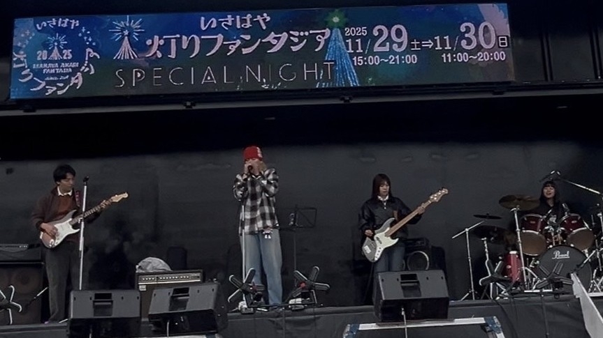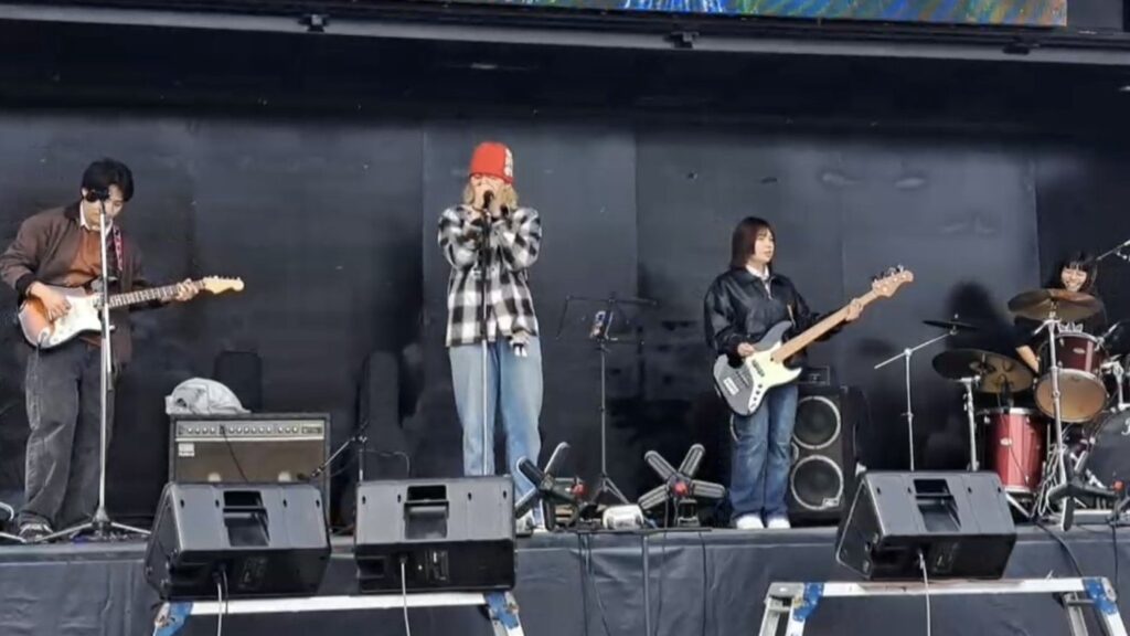 初冬の冷たい空気を一瞬で吹き飛ばすような、エネルギー全開の力強いサウンドを響かせ、観客を魅了しました。披露した楽曲は、「チーズファクトリー」「世界を終わらせて」「グッドな音楽を」など、ジャンルをまたいだバリエーション豊かなセットリスト。どの曲もメンバーたちのカラーが光り、息の合ったサウンドが会場いっぱいに広がりました。客席からは自然と手拍子が湧き上がり、音楽と観客の一体感がステージをさらに熱く盛り上げます。トップバッターとしての大役を見事に果たした彼ら。日頃の練習の成果を“サウンド”に込めて、地域の人々とのつながりを紡いでくれました。