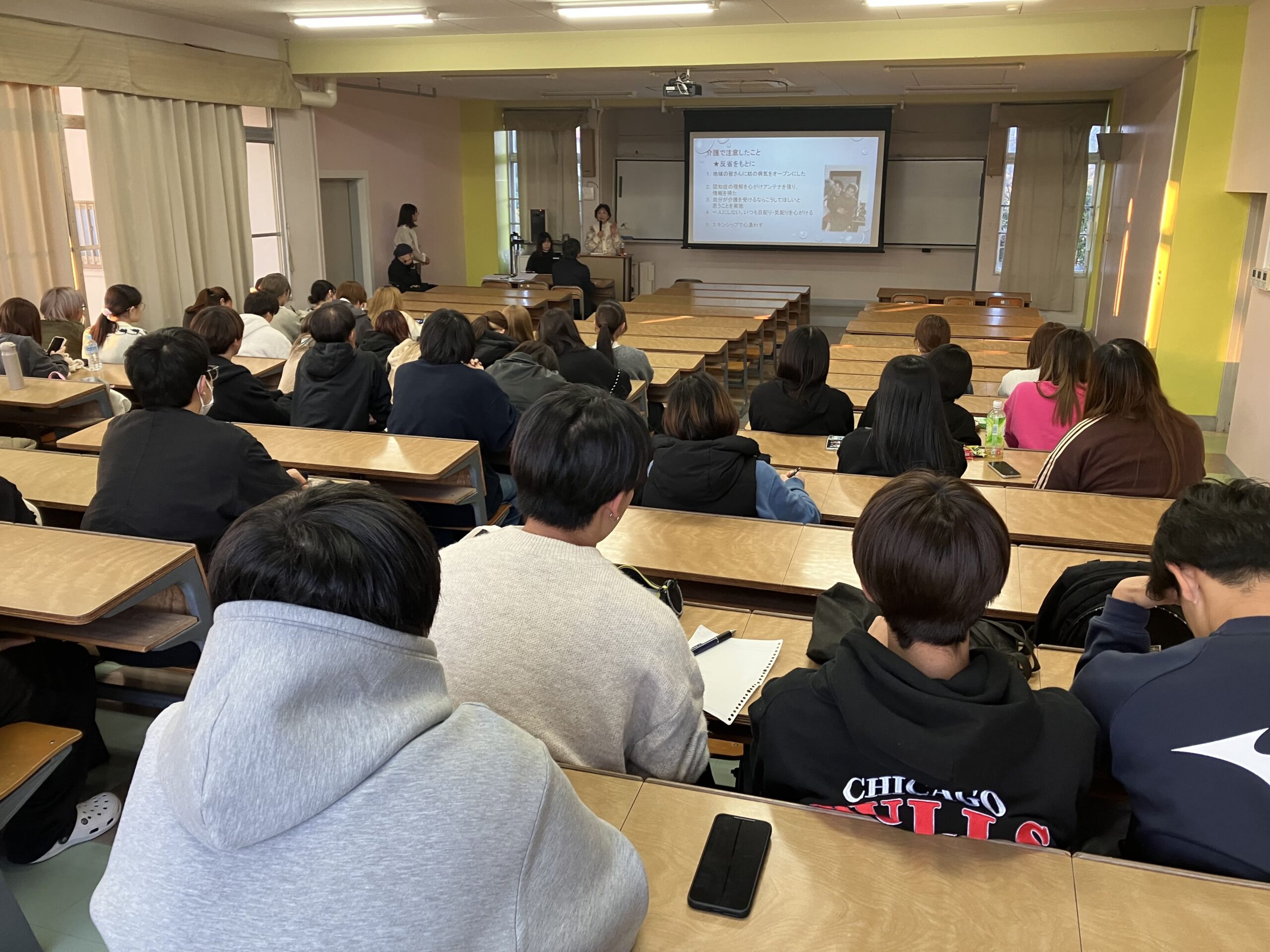 ご自身のご家族の認知症介護の体験の中から見い出した様々な気づきや学びとともに、介護上の留意点や家族会の活動についてお話を頂きました。学生達は認知症ご本人を支えるだけでなく、ご家族への支援の重要性についても学ぶことができました。渡部先生、ご講義頂きありがとうございました。