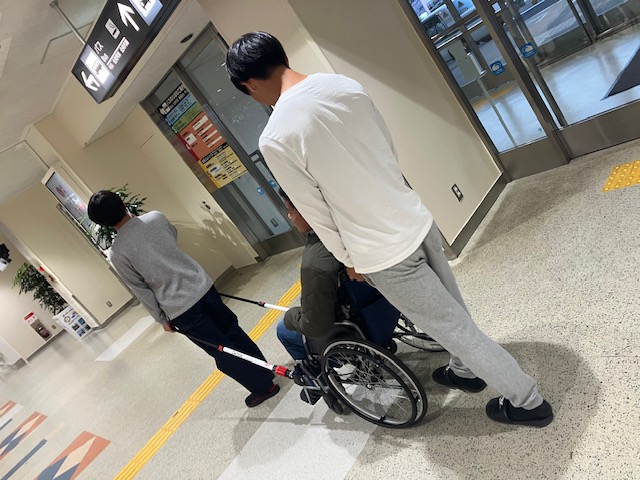 社会福祉学科の講義では、大学教員の他に現場職員や当事者の方々など様々な方々を授業にお招きしたり、実際に現場を視察したりする中で授業が展開されます。先日の基礎演習Ⅲの山口ゼミでは「観光と福祉のかかわりを学ぶ」をテーマに、大村空港にある長崎県ユニバーサルツーリズムセンターの相談デスクを見学致しました。 ユニバーサルツーリズムとは、「すべての人が楽しめるよう創られた旅行であり、高齢や障がい等の有無にかかわらず、誰もが気兼ねなく参加できる旅行」のことを指します。長崎県ユニバーサルツーリズムセンターでは、県内宿泊施設や観光施設におけるバリアフリーなどの情報提供を行うとともに、旅の道中でお手伝いが必要な方への介助人材の派遣、車椅子やベビーカーの手配など様々な情報・サービスを提供しておられるとのことでした。近年の長崎県のユニバーサルツーリズムの状況や相談窓口での対応の実際についてお話を伺うとともに、「JINRIKI」という旅行時や災害時の車いすでの移動をサポートする支援器具を体感することもできました。